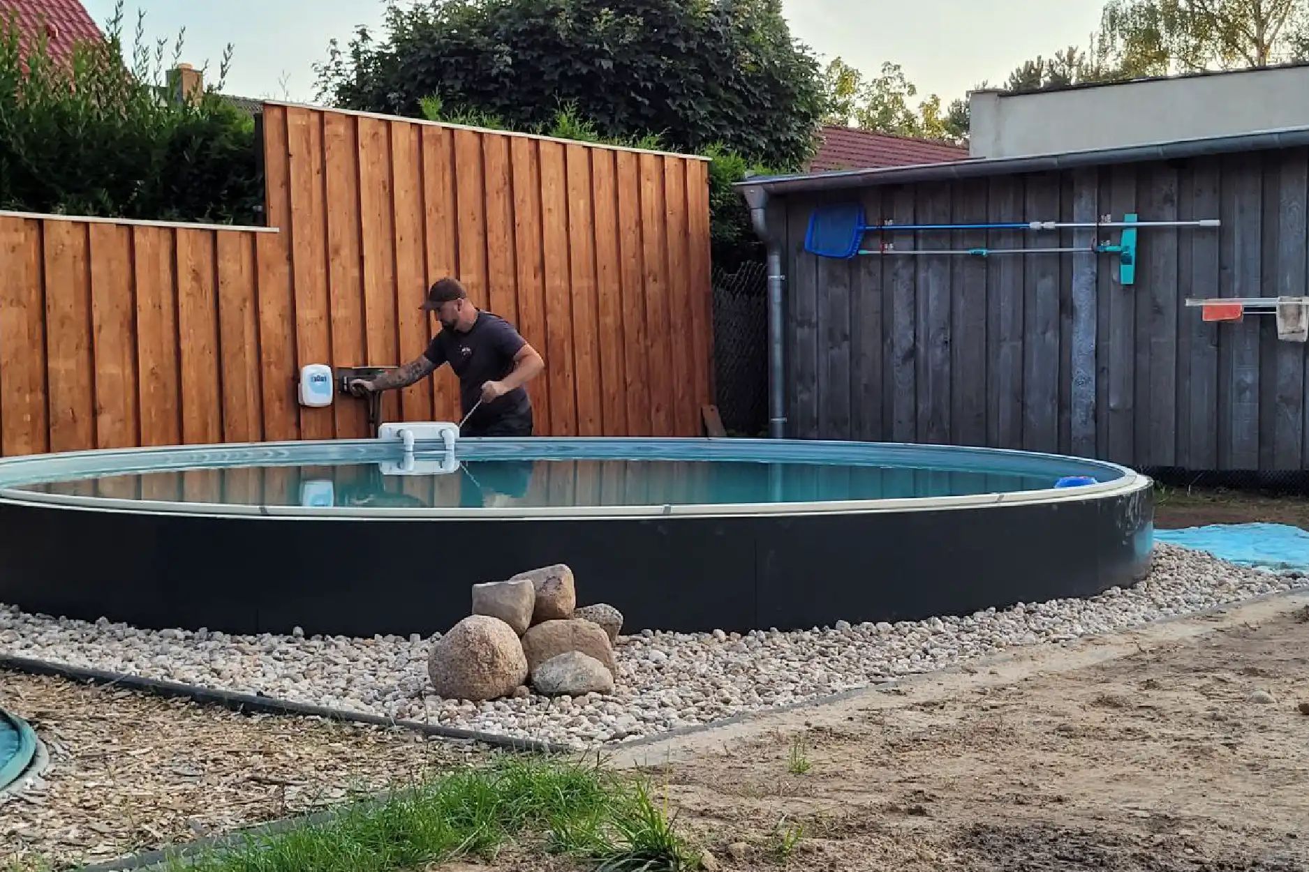 Wir haben das Loch von einer Baufirma machen lassen. Den Rest hat ein Freund und ich gemacht. Als wir den Boden vorbereitet haben, hatte es leider fast 35 °C, und wir haben uns kräftig die Haut verbrannt. Am nächsten Tag war es zum Glück stark bewölkt.