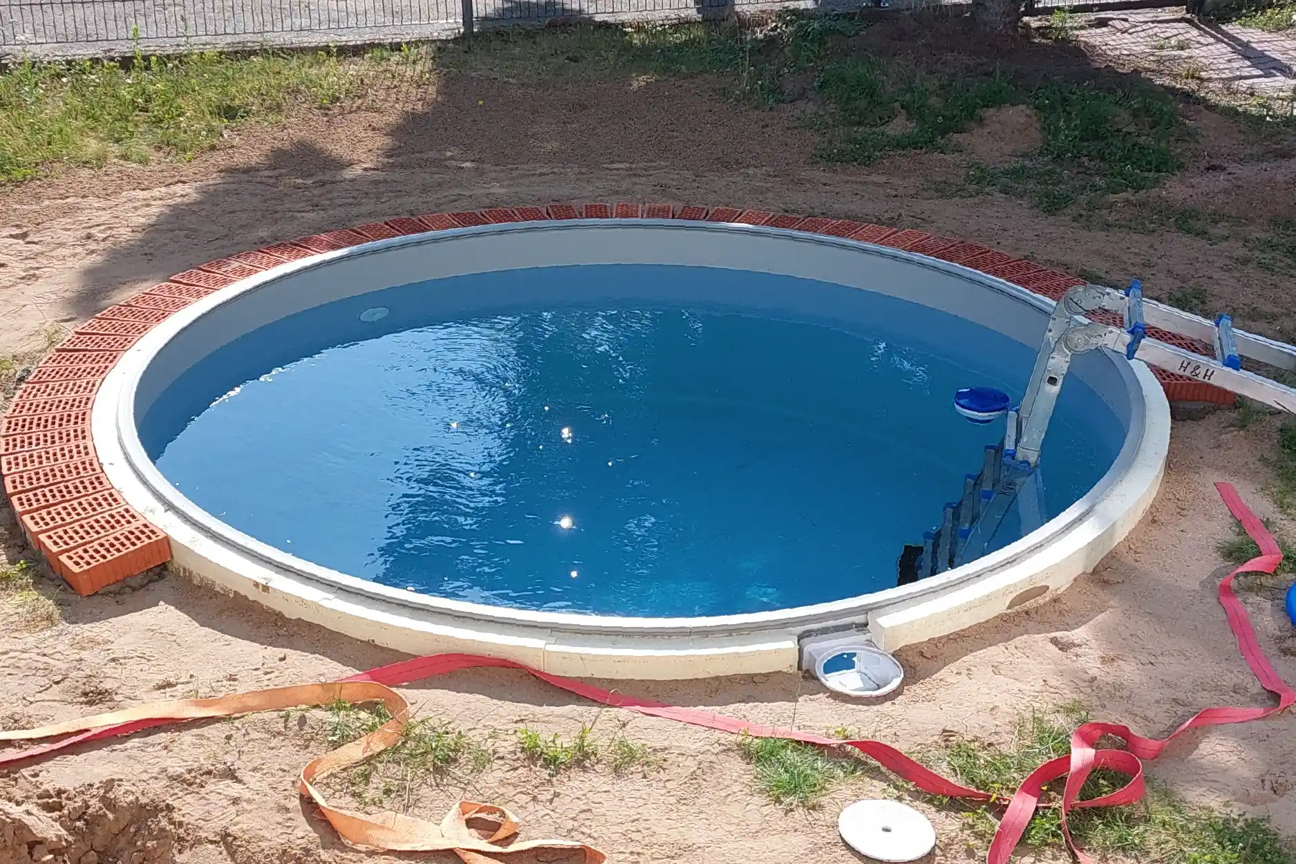 Nach dem Ausheben für das entsprechende Loch haben wir ca. 7 Stunden zu dritt benötigt, bis der Pool soweit stand. Geholfen haben uns außerdem zwei Spanngurte, die den Pool stabil gehalten haben. Um die Stabilität nicht zu gefährden, mussten wir den Pool mit Wasser füllen – auch wenn es schon November war und wir ihn leider nicht mehr nutzen konnten. Nun wurde alles zugeschüttet, und der Pool überwinterte mit seiner Winterfolie.